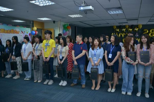 在简单而隆重的志愿者授旗仪式后,中智广州公司28周年庆活动正式拉开帷幕。二十八年风雨磨砺、二十八年披星戴月、二十八年的荣耀和感动。在这28年来,中智广州不断在人力资源行业中顽强探索,不断地实现“高质量发展”目标。至今为止,中智广州公司客户总数已达 6,000 余家,上年服务雇员人数突破170,000人,客户数量及服务雇员人数保持着强劲的增长。而这一个个不断攀升的跃动数字的背后,是客户对我们的肯定与支持,也是各位员工辛勤工作共同努力的成果。为了感谢同事们多年来的辛勤工作,在中智广州28周年庆的当天,对入职5年以上员工进行颁奖。一路同行,感谢有你。